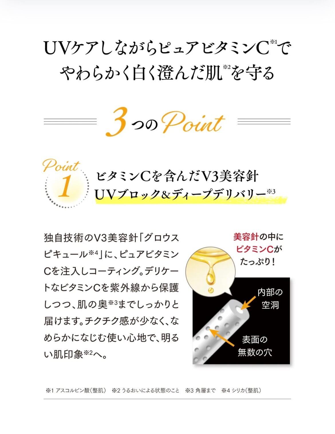 SPICAREが培ってきた独自製法 「V3美容針*3」の技術により、ピュアビタミンCを肌へ行きわたらせ*4 、美容成分をスピケアUVアイテム史上最高配合率*5 で配合した、リッチな「美容成分配合UV」